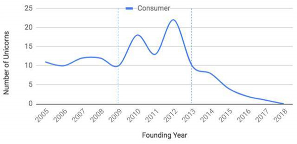 KPCB合伙人Eric Feng在2018年曾發(fā)過(guò)一篇文章,叫做《消費已死,消費長(cháng)存》(Consumer startups are dead. Long live consumer startups.)。在這篇文章中,他曾指出,消費創(chuàng )業(yè)在經(jīng)歷了2009年-2013年的黃金時(shí)代之后,慢慢滑入低谷,隨著(zhù)黃金時(shí)代建立的企業(yè)慢慢站穩腳跟、成為巨頭,到他發(fā)文的2018年,消費創(chuàng )業(yè)企業(yè)已經(jīng)歸零。