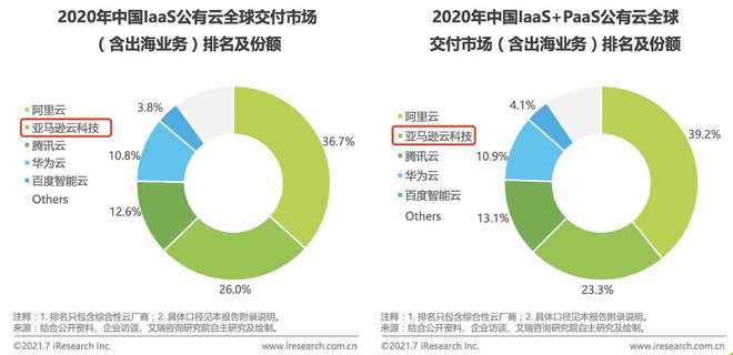 8 月 5 日消息,艾瑞咨詢(xún)最近正式發(fā)布了《2021 年中國基礎云服務(wù)行業(yè)數據報告》。報告顯示,在 2020 年中國 IaaS 公有云全球交付市場(chǎng) (含出海業(yè)務(wù)) 和中國 IaaS+PaaS 公有云全球交付市場(chǎng) (含出海業(yè)務(wù)) 兩項市場(chǎng)數據中,亞馬遜云科技均排名第二位,市場(chǎng)份額分別為 26.0% 和 23.3%。