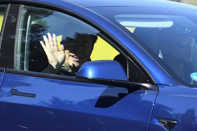 圖示:8 月 13 日,馬斯克乘車(chē)抵達柏林超級工廠(chǎng)建筑工地時(shí)向窗外揮手致意