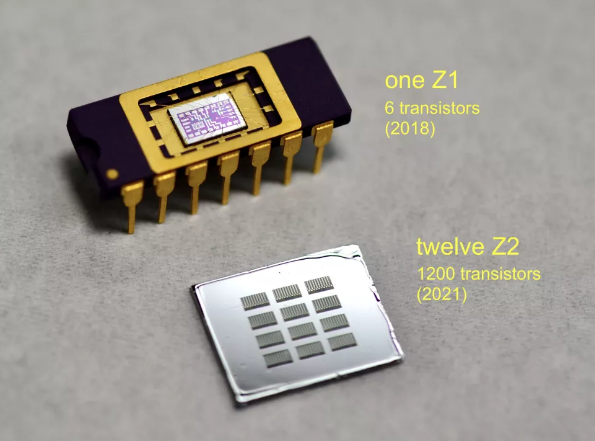 新款芯片被恰當地命名為“Z2”,在 10 微米的多晶硅柵極工藝上裝有 100 個(gè)晶體管。這與英特爾在 20 世紀 70 年代初創(chuàng )造其 4004 CPU 時(shí)使用的技術(shù)相同,但直接比較這兩者有點(diǎn)不公平,因為英特爾的芯片有 2300 個(gè)晶體管。
