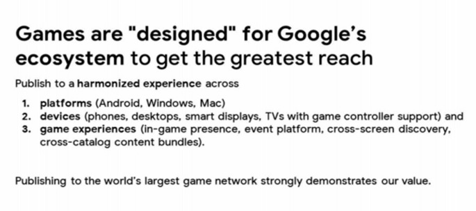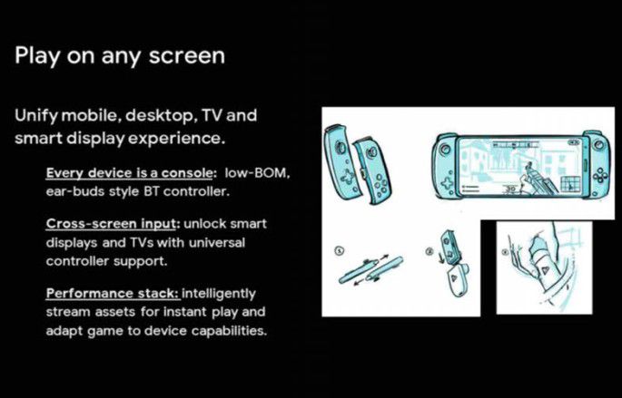 在這份標題為《游戲未來(lái)》(Games Futures)的機密文件中,谷歌暢想了這樣一個(gè)游戲平臺,可知其覆蓋了支持游戲手柄的 Windows PC、Mac、智能顯示屏、以及電視機等設備。