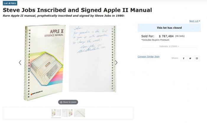 本屆 RR Auction 拍賣(mài)會(huì )上,除了罕見(jiàn)、尚能運行的 Apple-1 電腦以約合 240 萬(wàn)人民幣成拍之外,還有多款非常有價(jià)值的蘋(píng)果相關(guān)產(chǎn)品被拍賣(mài)。其中由史蒂夫·喬布斯(Steve Jobs)和邁克·馬庫拉(Mike Markkula)簽名的 Apple II 手冊共有 46 人出價(jià),最終成拍價(jià)格為 787484 美元(約合 5119827.23 元)。