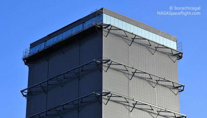 在三角形“防風(fēng)艙”徹底完工幾個(gè)月后,SpaceX 開(kāi)始建造更大的盒子狀建筑,最終被稱(chēng)為星際飛船工廠(chǎng)的“中艙”(MidBay)。“中艙”高約 45 米,旨在支持星際飛船儲罐的多層鋼環(huán)組裝。但不知出于什么原因,這座“中艙”似乎太矮,無(wú)法支持整個(gè)星際飛船的組裝過(guò)程。取而代之的是,當星際飛船的儲罐部分組裝完成后,SpaceX 將不得不將其從“中艙”中移出,以便安裝鼻錐。