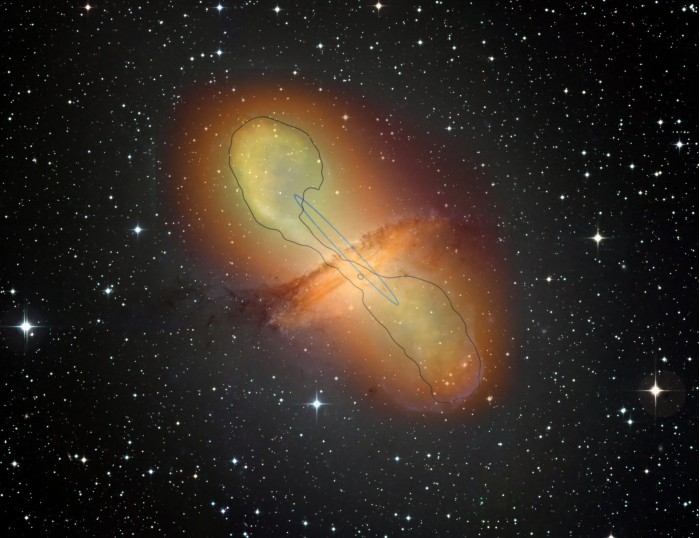 半人馬座A的綜合圖像,顯示了從該星系的中心黑洞中出現的噴流,以及相關(guān)的伽馬輻射。