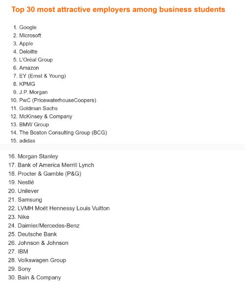 與 Google 一起躋身前五的是微軟、蘋(píng)果、德勤和歐萊雅集團。報告還顯示,商學(xué)院畢業(yè)生更傾向于銀行和咨詢(xún)公司。排名前 20 的銀行中有一半是摩根大通和高盛這樣的銀行,還有麥肯錫公司和德勤這樣的咨詢(xún)公司。