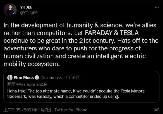 眾所周知,“法拉第”是指賈躍亭的汽車(chē)品牌“法拉第未來(lái) FF”,該品牌的首款汽車(chē) FF91 將在明年 7 月量產(chǎn)與交付,馬斯克指的“競爭對手”正是 FF。