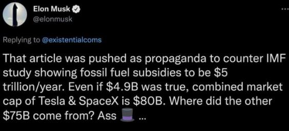 這篇文章被一位 Twitter 用戶(hù)用來(lái)批評馬斯克涉嫌通過(guò)過(guò)度夸大其公司的生產(chǎn)能力來(lái)抬高股價(jià)。這位高管當時(shí)回應說(shuō),這篇文章是為了反駁國際貨幣基金組織(IMF)的研究而發(fā)表的 “宣傳”,該研究概述了給予化石燃料公司的 5 萬(wàn)億美元的補貼。他補充說(shuō),49 億美元只是特斯拉和 SpaceX 800 億美元總市值的一小部分。