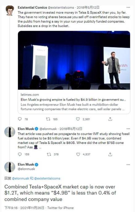現在,在最初的回復三年后,這位 SpaceX 的負責人回復了同一個(gè)用戶(hù),概述了他的電動(dòng)汽車(chē)和太空運輸公司已經(jīng)發(fā)展到了 1.2 萬(wàn)億美元的總市值,導致 49 億美元的政府支持還不到其價(jià)值的 0.4%。