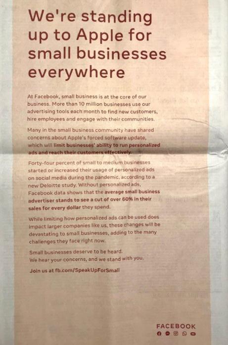 愛(ài)范兒曾寫(xiě)過(guò),《金融時(shí)報》的一項調查發(fā)現,自從今年 4 月蘋(píng)果開(kāi)始實(shí)行新的隱私設置,Facebook 等四大社交平臺損失近百億美元。2020 年 12 月,Facebook 曾用整版報紙廣告批評這項隱私設置,認為它將傷害依賴(lài)個(gè)性化廣告的小型企業(yè)。