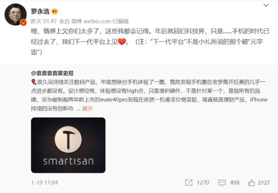 1 月 20 日凌晨,羅永浩在微博上轉發(fā)網(wǎng)友評論,并且再次預告自己年后將回歸科技界。