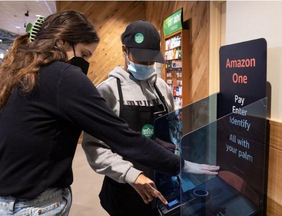 在這種模式里,進(jìn)入超市時(shí)要先進(jìn)行身份識別,顧客可以選擇掃描 Whole Foods Market 或亞馬遜應用程序中的店內代碼,在 Amazon One 上懸停手掌(Amazon One 使用包含專(zhuān)有計算機視覺(jué)算法的圖像掃描硬件來(lái)捕獲和加密手掌圖像),或插入與亞馬遜賬戶(hù)相關(guān)聯(lián)的信用卡或借記卡。