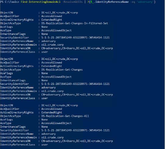 注意:- 此命令無(wú)法檢索 DCSync 權限的值,我們將始終將值視為“WriteAttributes”,我們需要從加入域的機器上運行此命令。