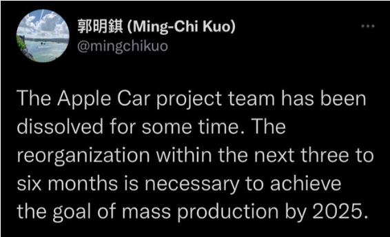 天風(fēng)國際分析師郭明錤在推特表示,此前爆料已久的蘋(píng)果 Apple Car 團隊已經(jīng)解散了一段時(shí)間。如果想在 2025 年量產(chǎn) Apple Car,需要在 3~6 個(gè)月內進(jìn)行團隊重組。