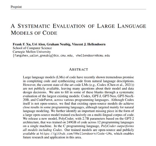 最近,卡內基梅隆大學(xué)(Carnegie Mellon University)的研究人員發(fā)表了一篇論文 A SYSTEMATIC EVALUATION OF LARGE LANGUAGE MODELS OF CODE ,對比了現有的跨編程語(yǔ)言的編寫(xiě)代碼模型——Codex、GPT-J、GPT-Neo、GPT-NeoX 和 CodeParrot。通過(guò)對多個(gè)模型的比較和分析,這個(gè)團隊希望為代碼建模設計決策提供更多啟發(fā)。