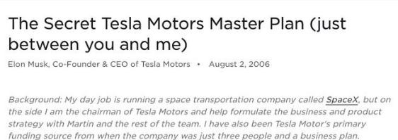 2006 年 8 月 2 日,馬斯克首次公布了其“秘密宏圖”,他在博文《特斯拉汽車(chē)的秘密宏圖(不要告訴別人)》中,介紹了特斯拉的四步計劃: