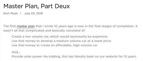 2016 年 7 月 20 日,馬斯克發(fā)表博文《秘密宏圖第二篇章》,表示 10 年前的規劃已處于最終收尾階段。