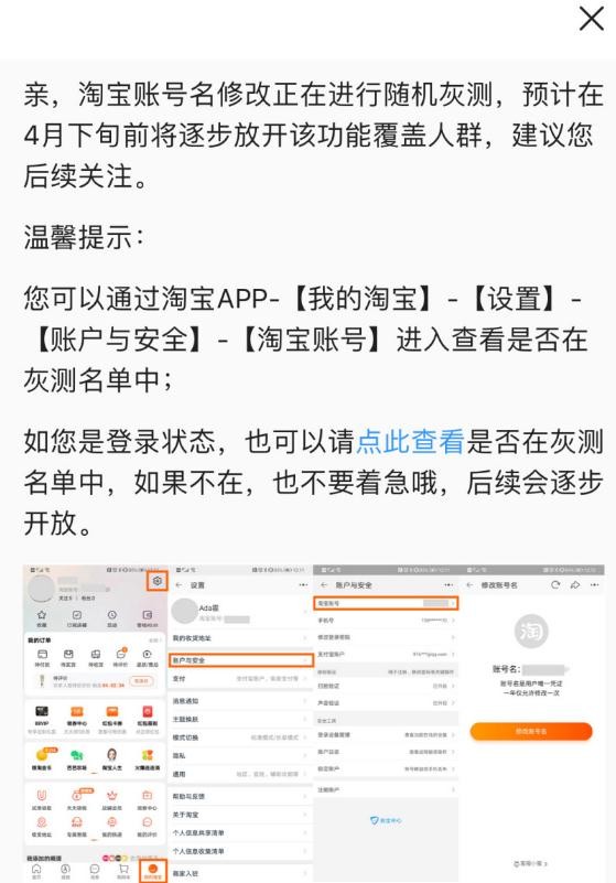 本月早些時(shí)候,IT之家報道了淘寶開(kāi)始內測修改會(huì )員名?,F在,根據淘寶客服小蜜的最新消息,該功能將在 4 月下旬前向更多人開(kāi)放。