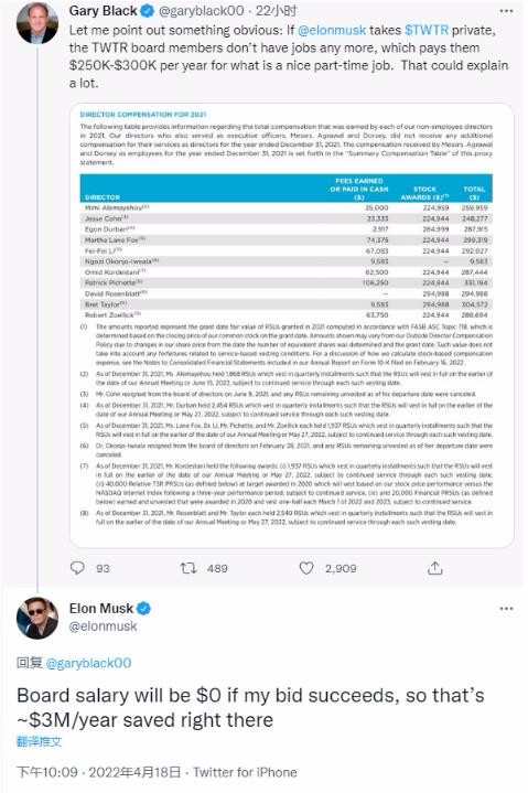 對此,馬斯克回復稱(chēng):“如果我成功收購 Twitter,董事會(huì )成員的薪水將為 0,這相當于每年為 Twitter 節省約 300 萬(wàn)美元的費用。”