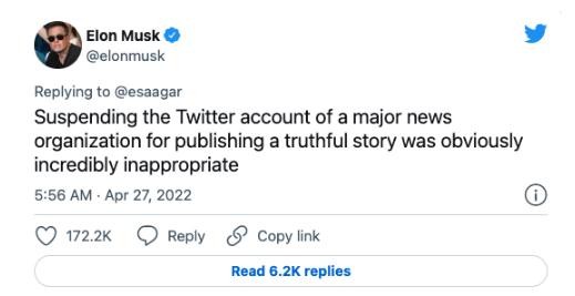 馬斯克周二又發(fā)了一條推文,批評推特首席律師維加亞?加德 (Vijaya Gadde),原因是推特在 2020 年決定阻止《紐約郵報》發(fā)布一篇關(guān)于美國總統 Biden 兒子 Hunter Biden 的報道。馬斯克認為,此舉“極其不合適”?!都~約郵報》當時(shí)稱(chēng),亨特與烏克蘭一家能源公司的一名高管有不正當關(guān)系。推特后來(lái)撤銷(xiāo)了這一決定,但在此之前,它被指控審查可能傷害民主黨候選人的信息。