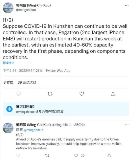 IT 之家 4 月 27 日消息,蘋(píng)果分析師郭明錤今日發(fā)推指出,假設昆山疫情形勢持續好轉,和碩昆山廠(chǎng)最早將于本周在重啟生產(chǎn)。根據零部件情況,預計和碩第一階段產(chǎn)能就可以恢復 40-60% 的水平。