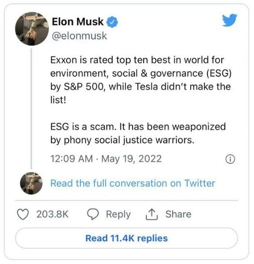 在特斯拉被踢出標普 ESG 指數成份股后,馬斯克在推特上表示,ESG 就是“一個(gè)騙局”。他抱怨稱(chēng),“??松梨诙急粯似?500 評為全球環(huán)境、社會(huì )和治理(ESG)前十,而特斯拉竟然沒(méi)有上榜!”