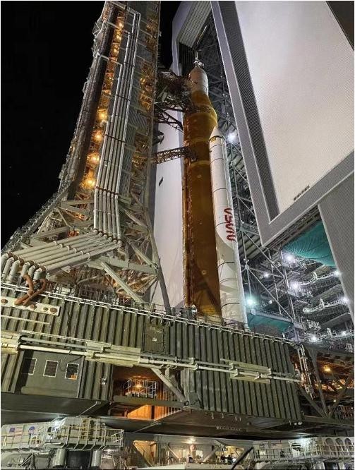 SLS 火箭和頂部的獵戶(hù)座飛船總高約 98 米,此前 3 月中旬曾從火箭組裝大樓出發(fā),花了約 10 個(gè)半小時(shí)才移動(dòng)到 6.4 公里外的肯尼迪航天中心 39B 發(fā)射臺。