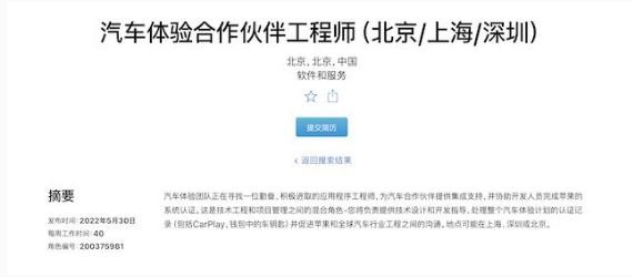 蘋(píng)果官網(wǎng)信息顯示,近期蘋(píng)果正在北京、上海、深圳三地招聘汽車(chē)體驗合作伙伴工程師。根據其職位描述,該崗位需要為汽車(chē)合作伙伴提供集成支持,并協(xié)助開(kāi)發(fā)人員完成蘋(píng)果的系統認證。
