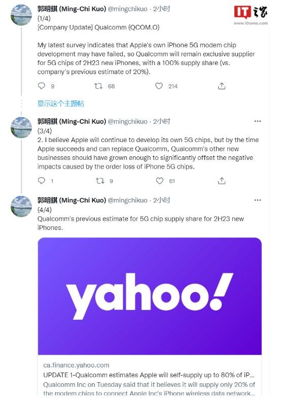 天風(fēng)國際分析師郭明錤今日在推特發(fā)布爆料,最新調查表明,蘋(píng)果自己的 iPhone 5G 基帶芯片開(kāi)發(fā)可能已經(jīng)失敗,因此高通將繼續成為 2023 年新 iPhone 的 5G 芯片獨家供應商,供應份額為 100%(高通此前估計為 20%)。