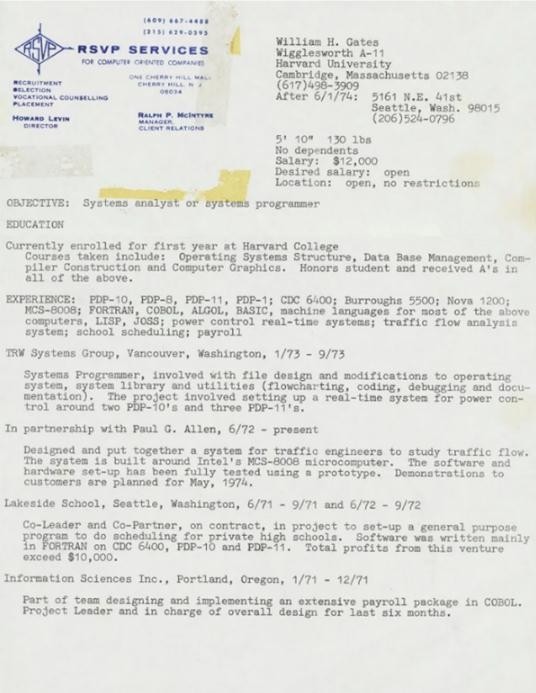 蓋茨的簡(jiǎn)歷似乎是用打字機打出來(lái)的,這在 1974 年非常正常,當時(shí)蓋茨和其他人正在幫助推廣個(gè)人電腦的使用。