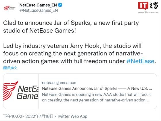 網(wǎng)易網(wǎng)絡(luò )游戲部門(mén)網(wǎng)易游戲宣布,正在開(kāi)設一個(gè)新的 AAA 工作室 Jar of Sparks,將專(zhuān)注于創(chuàng )造下一代敘事驅動(dòng)的動(dòng)作游戲。