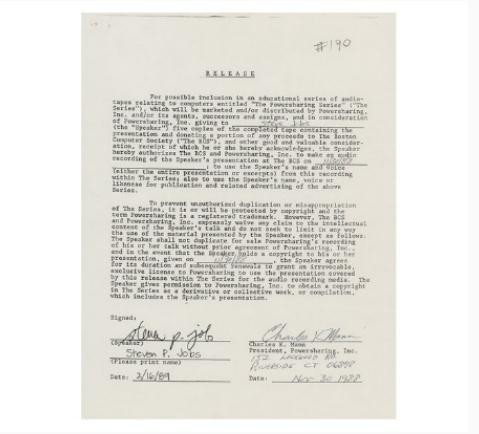 拍品還包括了當年喬布斯為 Powersharing 系列和早期 NeXT 計算機會(huì )議錄制的音頻,還包括計算機手冊和 Apple Newton MessagePad 等物品,但其中更獨特的是由喬布斯、Apple 聯(lián)合創(chuàng )始人 Steve Wozniak(史蒂夫·沃茲尼亞克)和許多其他人簽名的一系列文件、新聞稿等。這些文件包括參與 Powersharing 系列期間,眾多技術(shù)先驅簽署發(fā)布的表格包括比爾·蓋茨、埃斯特·戴森、皮克斯聯(lián)合創(chuàng )始人阿爾維·雷·史密斯、蘋(píng)果前首席執行官約翰·斯卡利等。