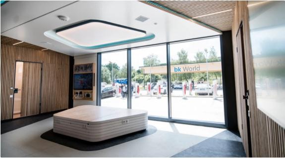 特斯拉現在通過(guò)與 bk World 合作嘗試一種全新模式。bk World 提供洗手間,舒適的休息區域可以吸引司機逗留、購物。