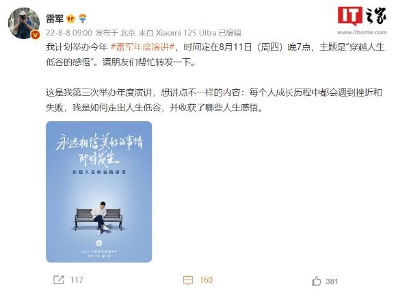雷軍通過(guò)社交媒體表示 年度演講主題是“穿越人生低谷的感悟” 10:08:01