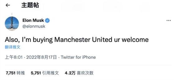 最近曼聯(lián)的流量實(shí)在太大,連特斯拉 CEO 馬斯克也橫插一腳。8 月 17 日,特斯拉 CEO 馬斯克在推特發(fā)文稱(chēng),將收購英超俱樂(lè )部曼聯(lián)。