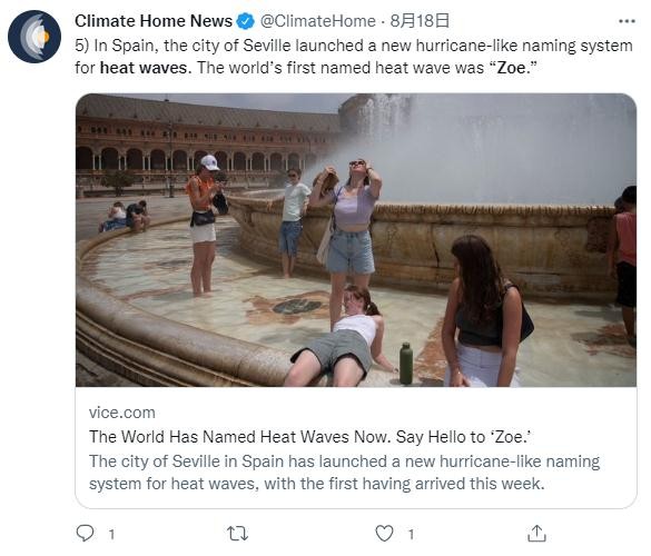 今年 7 月 24 日至 27 日期間西班牙塞維利亞氣溫飆升至 112 華氏度 (44.4 攝氏度),科學(xué)家將這股熱浪命名為“佐伊”(Zoe)。這也是科學(xué)家首次為熱浪命名。