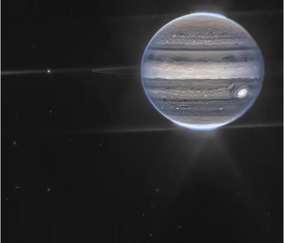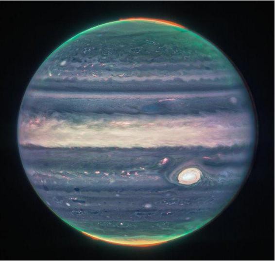 NASA 公布的木星照片是韋伯太空望遠鏡于今年 7 月份拍攝的,捕捉到了木星前所未有的南、北極光以及旋轉的極地霧霾。木星上著(zhù)名的大紅斑周?chē)h(huán)繞著(zhù)無(wú)數小風(fēng)暴,顯得格外明亮。