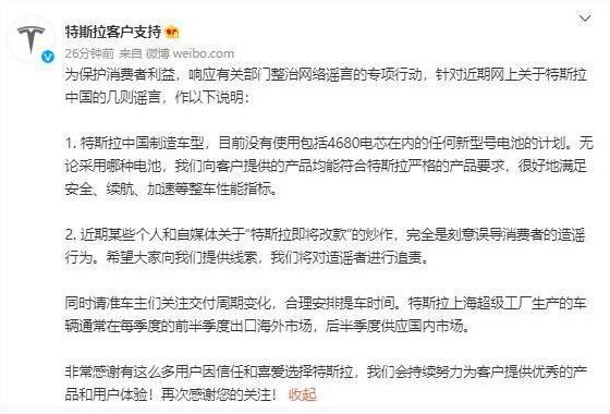 特斯拉發(fā)文表示 目前沒(méi)有使用包括4680電芯在內的任何新型號電池的計劃 10:38:41