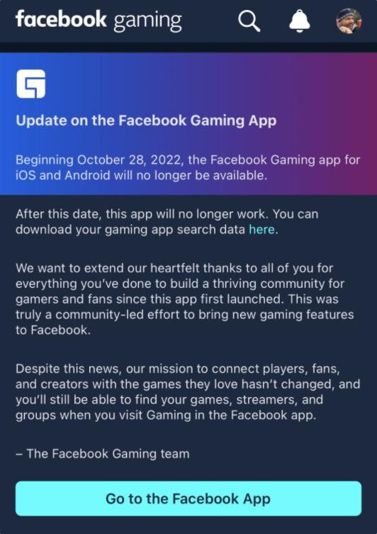 Meta 宣布,旗下 Facebook Gaming 游戲直播應用程序正在關(guān)閉。團隊在 Facebook Gaming 應用程序中發(fā)布了一條消息,提醒用戶(hù)和玩家,從 10 月 28 日開(kāi)始,該應用程序將不再支持 iOS 和 Android 平臺。