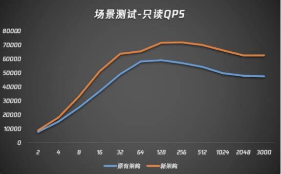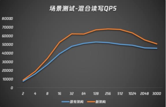 在只讀場(chǎng)景下,低線(xiàn)程數時(shí)搭載了新一代內核的騰訊云數據庫 MySQL 的 QPS 增幅較大,趨近直線(xiàn)上升,在線(xiàn)程數達到 64 以后 QPS 上升平緩,總體性能始終高于上一代版本,且在線(xiàn)程數為 16 時(shí),提升更是達到了近 25%。