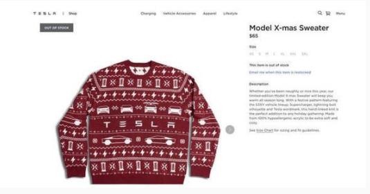 因為相關(guān)節日的即將來(lái)臨,特斯拉這家全球范圍內最大的電池汽車(chē)公司,居然在自己的海外官方網(wǎng)站上上線(xiàn)了一款圣誕毛衣。而且,這款產(chǎn)品似乎還非常合大部分消費者的心意,開(kāi)售一分鐘便成功售罄,目前已經(jīng)處于缺貨狀態(tài)。