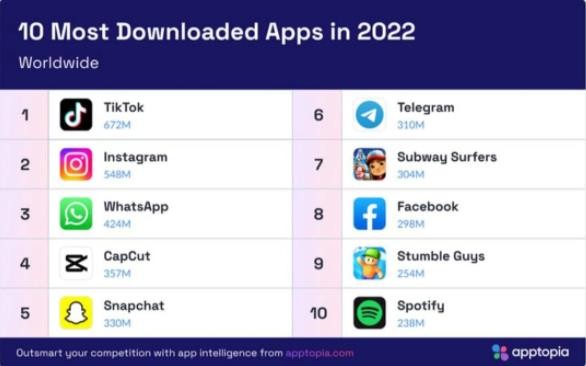 《福布斯》在最新文章中援引市場(chǎng)調查機構 Apptopia 公布的統計數據,報道了 2022 年全球應用下載量前十榜單。其中 TikTok 以 6.72 億次下載量位居榜首,而一款視頻編輯軟件 CapCut 以 3.57 億次位居第四。