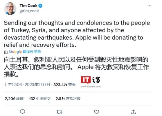 土耳其和敘利亞于 2 月 6 日發(fā)生 7.8 級強震,蘋(píng)果首席執行官蒂姆?庫克(Tim Cook)在最新推文中表示,將會(huì )捐款以資助災區救援和恢復工作。