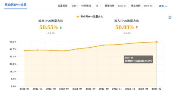 據國家 IPv6 發(fā)展監測平臺統計數據,2023 年 2 月,我國移動(dòng)網(wǎng)絡(luò ) IPv6 占比達到 50.08%,首次實(shí)現移動(dòng)網(wǎng)絡(luò ) IPv6 流量超過(guò) IPv4 流量的歷史性突破,標志著(zhù)我國推進(jìn) IPv6 規模部署及應用工作迎來(lái)了新的里程碑。
