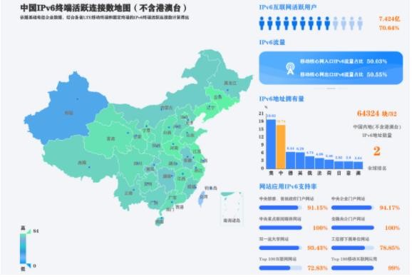統計平臺數據顯示,截至IT之家發(fā)文,我國 IPv6 互聯(lián)網(wǎng)活躍用戶(hù)達 7.424 億,占比達到了 70.64%。