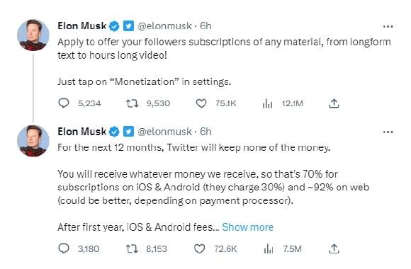 馬斯克補充道,在服務(wù)上線(xiàn)最初的 12 個(gè)月中,內容發(fā)布者將獲得除去移動(dòng)平臺費用(iOS 或安卓商店抽成 30%)之外的全部訂閱收入,推特不會(huì )從中截留任何一分錢(qián)。網(wǎng)頁(yè)版則能讓創(chuàng )作者拿到 92% 的收入,所以馬斯克也更推薦這一選項。