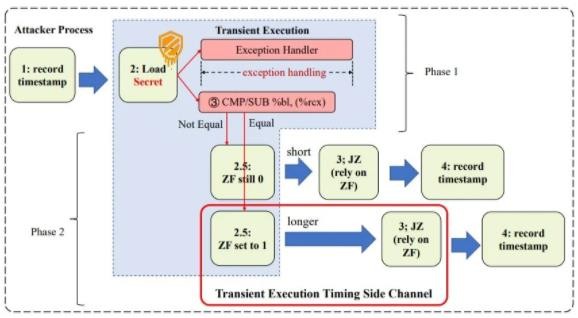 簡(jiǎn)單來(lái)說(shuō),要想利用這個(gè)漏洞實(shí)現攻擊,首先應該通過(guò) EFLAGS 寄存器觸發(fā)(包含秘密數據)編碼的瞬態(tài)執行,然后測量 JCC 指令的執行時(shí)間來(lái)獲取該編碼數據的內容。