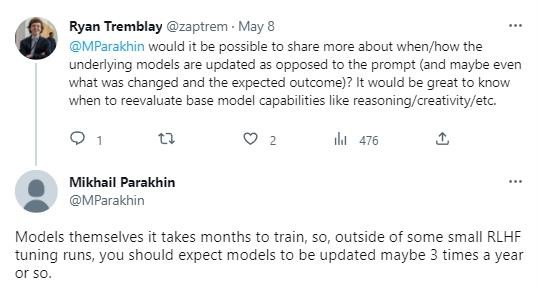 近日一位用戶(hù)在推特上向微軟廣告和網(wǎng)絡(luò )服務(wù)部門(mén)的首席執行官米哈伊爾?帕拉欣(Mikhail Parakhin)詢(xún)問(wèn),微軟是如何以及何時(shí)更新聊天機器人的模型的。
