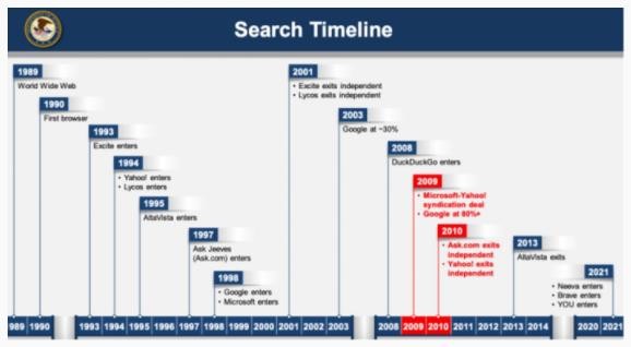 在美國司法部的搜索市場(chǎng)時(shí)間表中,你可以看到長(cháng)達十多年的搜索壟斷。重要的是,這十年是谷歌收購安卓并壟斷移動(dòng)搜索新技術(shù)的時(shí)期。2010 年至 2012 年,美國監管部門(mén)進(jìn)行了調查,認定新的移動(dòng)生態(tài)系統將由少數幾家公司組成,即谷歌和 Facebook,但沒(méi)有提出起訴。