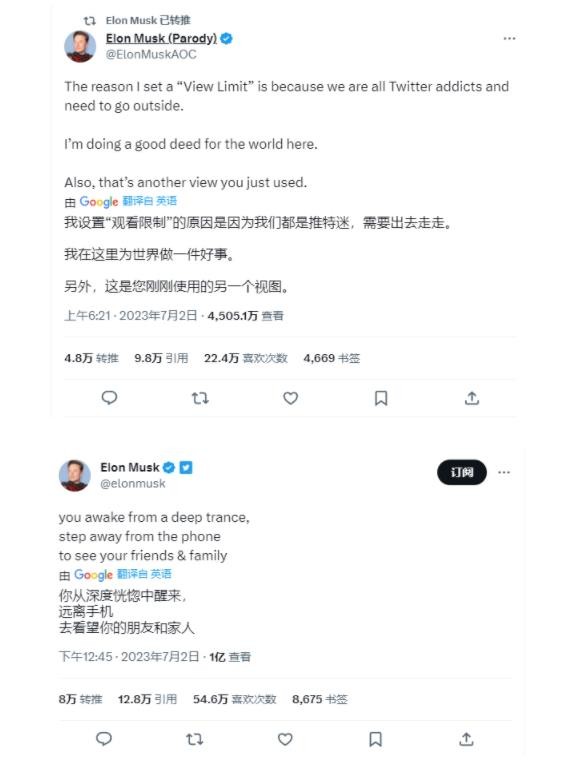 除了將限制第三方抓取推特數據作為對用戶(hù)進(jìn)行瀏覽量限制的理由,推特老板馬斯克還發(fā)推文補充稱(chēng):“我設置推文瀏覽量的限制是因為我們都是‘推特成癮者’,每天大家都恍惚于網(wǎng)絡(luò )世界,(所以)我這是在為世界做一件好事,大家應該都離手機遠點(diǎn),需要到外面去多進(jìn)行社交活動(dòng),多去看看你的朋友和家人。”馬斯克在推文的最后還調侃:“你又用了一次瀏覽次數 "。