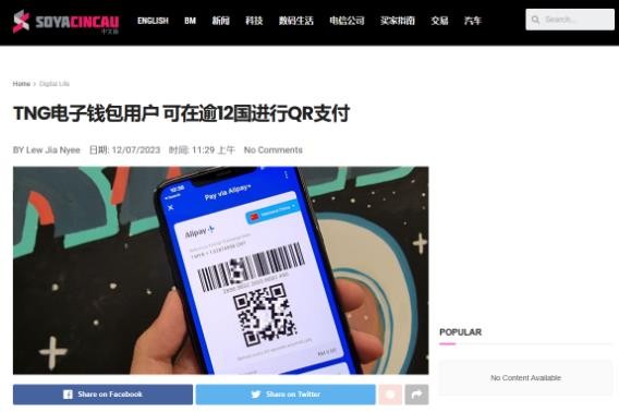 據馬來(lái)西亞媒體 SoyaCincau 報道,馬來(lái)西亞 Touch'n Go (中文名為一觸即通)子公司 TNG Digital 的 CEO 倪翔近日表示,Touch'n Go eWallet 已聯(lián)通支付寶中國商家網(wǎng)絡(luò )。此舉意味著(zhù)在中國內地的大馬用戶(hù)可使用自己的支付軟件完成掃碼支付,“就像中國人用支付寶一樣方便”。目前,Touch'n Go eWallet 為馬來(lái)西亞最大的電子錢(qián)包服務(wù)提供商。